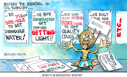 Many Nigerians are doing all in their power to scuttle government's plans to remove subsidy from petrol, but it seems those in authority are bent on having their way with this 'anti-people' policy... The above cartoon aptly captures some of the many reasons why the timing of this policy is wrong. Someone please tell President Goodluck Jonathan that the people who voted for him into power are not in support of this policy.