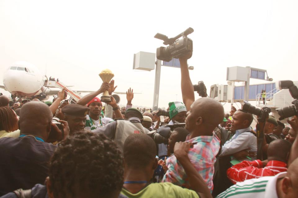 Nigeria’s national football team, the Super Eagles arrived Abuja on Tuesday afternoon, after winning the country’s first Africa Cup of Nations trophy in nearly two decades and were welcomed by adoring crowds at a huge ceremony inside the National Stadium.