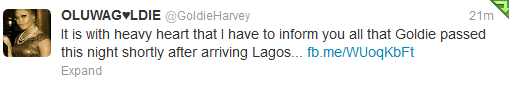 Goldie, whose real name is Susan Oluwabimpe Harvey, died in the arms of her best friend Denrele Edun. Her death has been confirmed by her record label, Kennis Music.