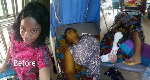 The lady pictured above has been hospitalised after suffering an unfortunate mishap in Nnewi area of Anambra state. According to Christabeler Akunna, she went to visit her friend when the accident happened which saw her injure badly after falling from a building.