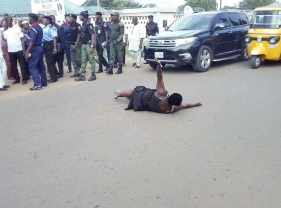 The staff were protesting against the non-payment of their 13 months salaries when the woman proceeded to lie in the middle of the road to express her displeasure.
