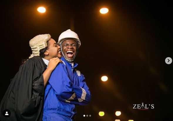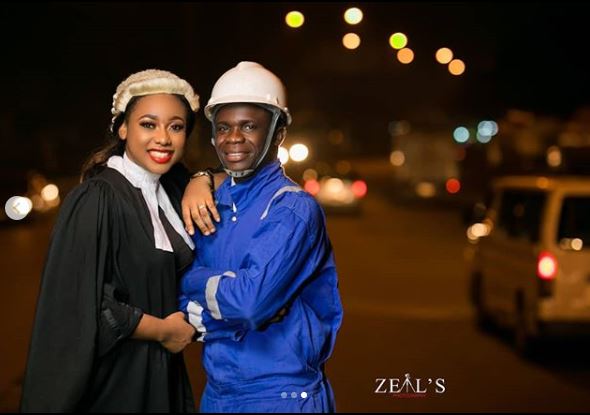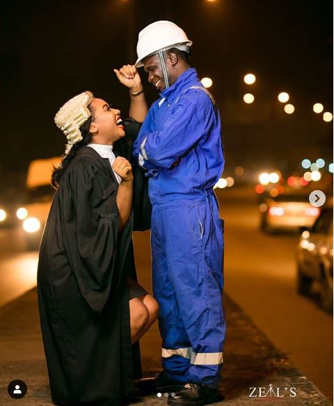 An obviously excited Nigerian couple dress up in their professional regalia for their pre-wedding shoot, causing quite a stir on social media, with many showering them with loving comments.