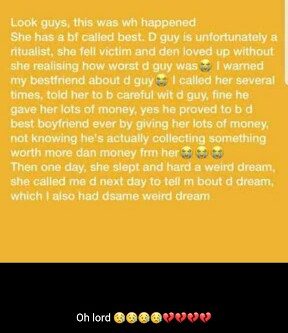 According to reports on social media, a model and video vixen, Wendy opened up to her friend that she had a dream that her boyfriend, Best Jide, who was spending money on her had used her for rituals, leading to her bleeding when she woke up.