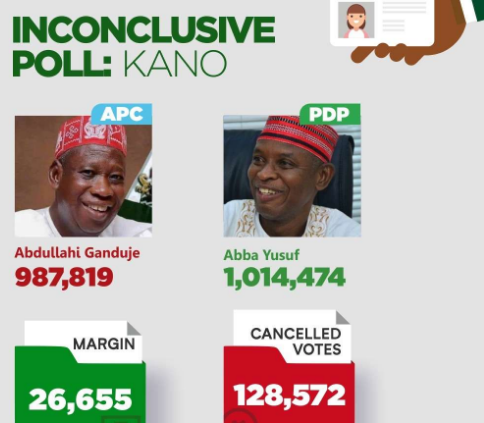 Early results from the areas in which the re-run held in Kano showed that Governor Abdullahi Ganduje of the APC and Abba Kabir-Yusuf of the PDP were running a tight race.